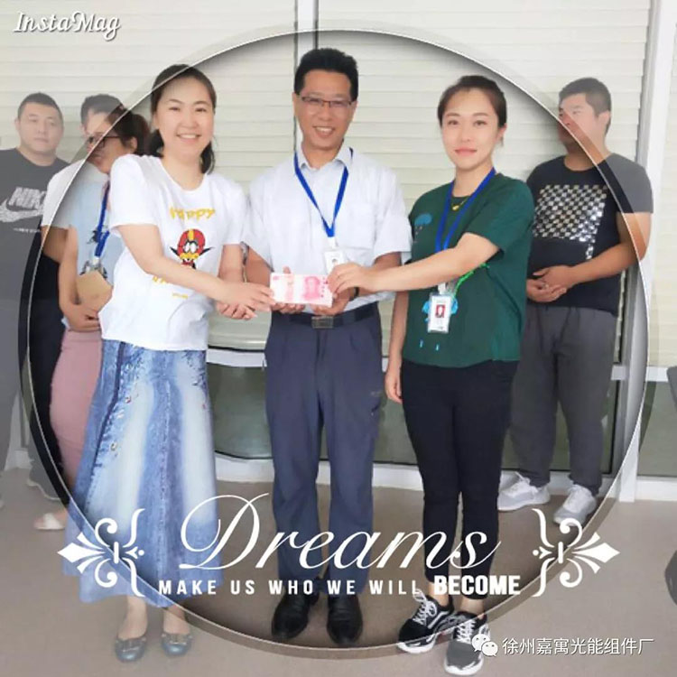 7月17日,在嘉寓光能總經(jīng)理陳志榮的辦公室里,陳總再一次對(duì)負(fù)責(zé)此次活動(dòng)的管理部、業(yè)務(wù)部進(jìn)行了表揚(yáng),陳總表示:大家的努力我們有目共睹,大家的團(tuán)結(jié),使得活動(dòng)圓滿成功!在陳總及生產(chǎn)部副總古海東的見證下,公司執(zhí)行副總何植業(yè)為管理部及業(yè)務(wù)部發(fā)放了獎(jiǎng)金,并對(duì)兩個(gè)部門的領(lǐng)導(dǎo)進(jìn)行了了特別表彰。何總的話令人鼓舞,室內(nèi)掌聲熱烈,這掌聲是對(duì)被獎(jiǎng)勵(lì)者贏得榮譽(yù)的肯定,也是對(duì)今后工作的鼓勵(lì)。