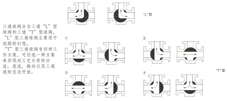 電動(dòng)高平臺(tái)三通球閥是由高平臺(tái)三通球閥和氣動(dòng)執(zhí)行器組成,連接方式有內(nèi)螺紋連接、卡箍式連接、外螺紋連接等,三通球閥分為L(zhǎng)型三通球閥和T型三通球閥,用于不能管道介質(zhì)流向的切換,流向切換圖件下圖,由于球閥使用了高平臺(tái)設(shè)計(jì),使得閥門(mén)和電動(dòng)執(zhí)行器可以直接連接,免去支架安裝的高度。具有結(jié)構(gòu)緊湊、外形美觀、方便安裝等特點(diǎn)。不同的閥門(mén)使用工況,可以選用不同的電動(dòng)執(zhí)行器,閥門(mén)和開(kāi)關(guān)量控制的電動(dòng)執(zhí)行器組成電動(dòng)開(kāi)關(guān)球閥,閥門(mén)和模擬量4-20mA控制的電動(dòng)執(zhí)行器組成電動(dòng)調(diào)節(jié)球閥。