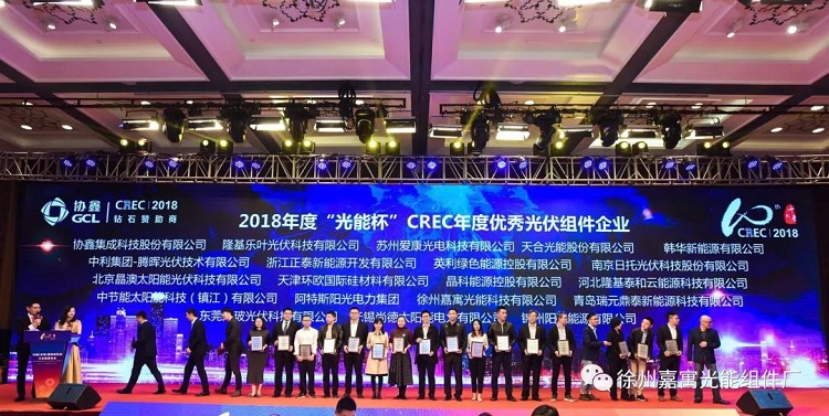 10月31日,由中國(無錫)國際新能源大會暨展覽會CREC、Solarbe索比光伏網、《光能》雜志共同主辦的2018CREC光能杯光伏行業(yè)頒獎晚會盛大召開,徐州嘉寓光能榮獲“年度優(yōu)秀組件企業(yè)大獎”。