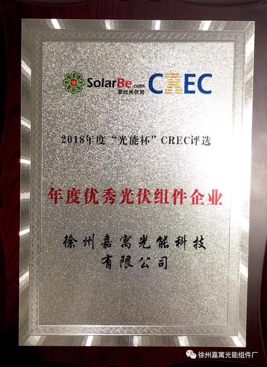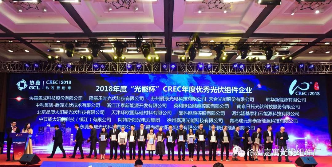 10月31日,由中國(無錫)國際新能源大會暨展覽會CREC、Solarbe索比光伏網(wǎng)、《光能》雜志共同主辦的2018CREC光能杯光伏行業(yè)頒獎晚會盛大召開,徐州嘉寓光能榮獲“年度優(yōu)秀組件企業(yè)大獎”。