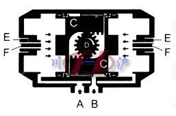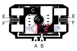 壓縮空氣從氣口(B)進(jìn)入氣缸兩活塞(C)之間中腔時(shí),使兩活塞分離向氣缸兩端方向移動(dòng),迫使兩端的彈簧壓縮,兩端氣腔的空氣通過氣口(A)排出,同時(shí)使兩活塞(C)的齒條同步帶動(dòng)輸出軸(D)(齒輪)逆時(shí)針方向旋轉(zhuǎn)90度。在壓縮空經(jīng)過電磁閥換向后,氣缸的兩活塞在彈簧的彈力下向中間方向移動(dòng),中間氣腔的空氣從氣口(B)排出,同時(shí)使兩活塞(C)的齒條同步帶動(dòng)輸出軸(D)(齒輪)順時(shí)針方向旋轉(zhuǎn)90度??梢詮膬啥苏{(diào)整微量角度,松動(dòng)螺母(E)用內(nèi)六角扳手?jǐn)Q動(dòng)調(diào)節(jié)螺栓(F)調(diào)整所需角度,鎖緊螺母(E)。 ■ 解剖圖及零配件